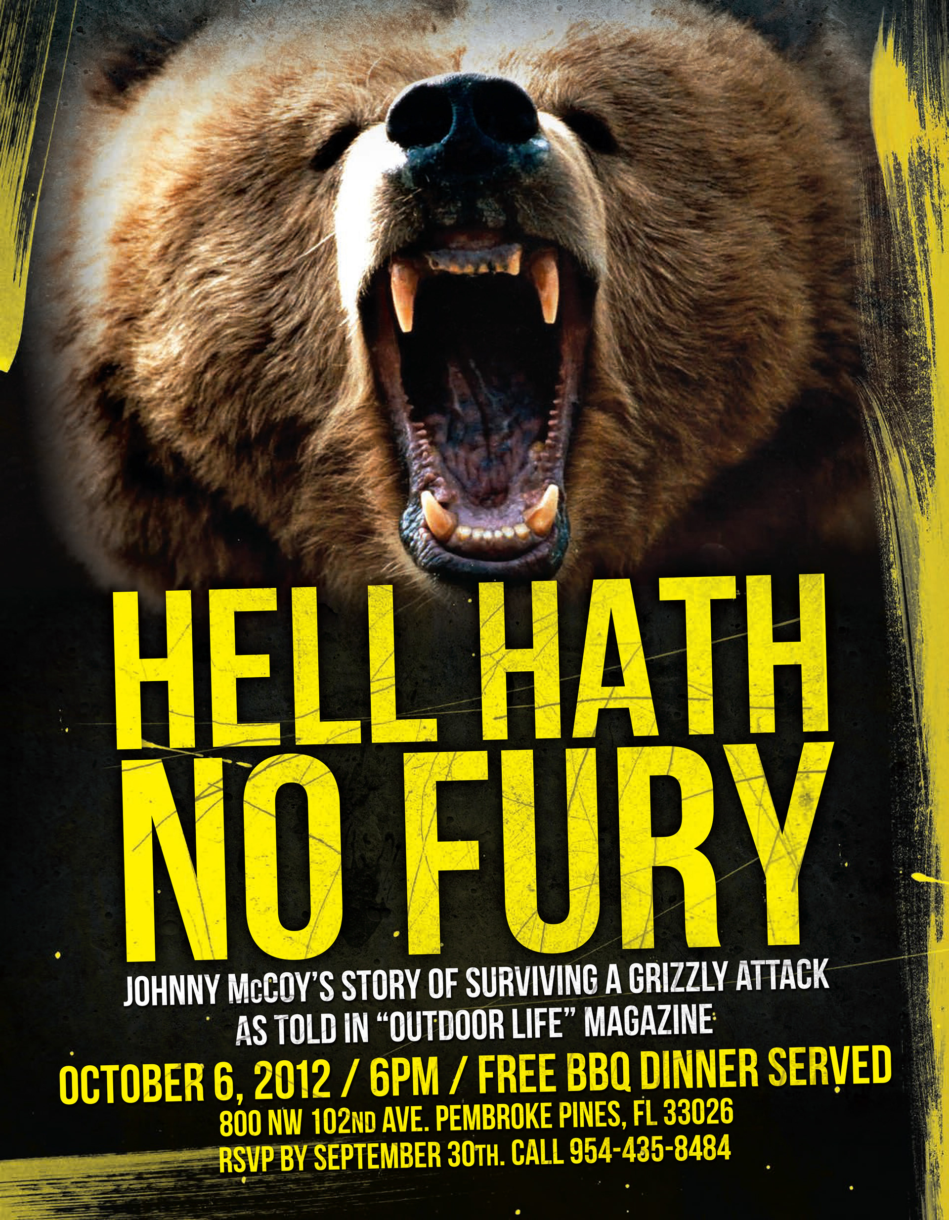 Flyer design for a local church to promote a guest speaker and his life changing encounter with a grizzly bear.