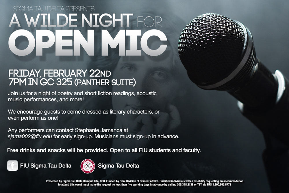 E-flyer for Sigma Tau Delta's Open Mic Night event, themed around different poets– but the night's event named after Oscar Wilde.