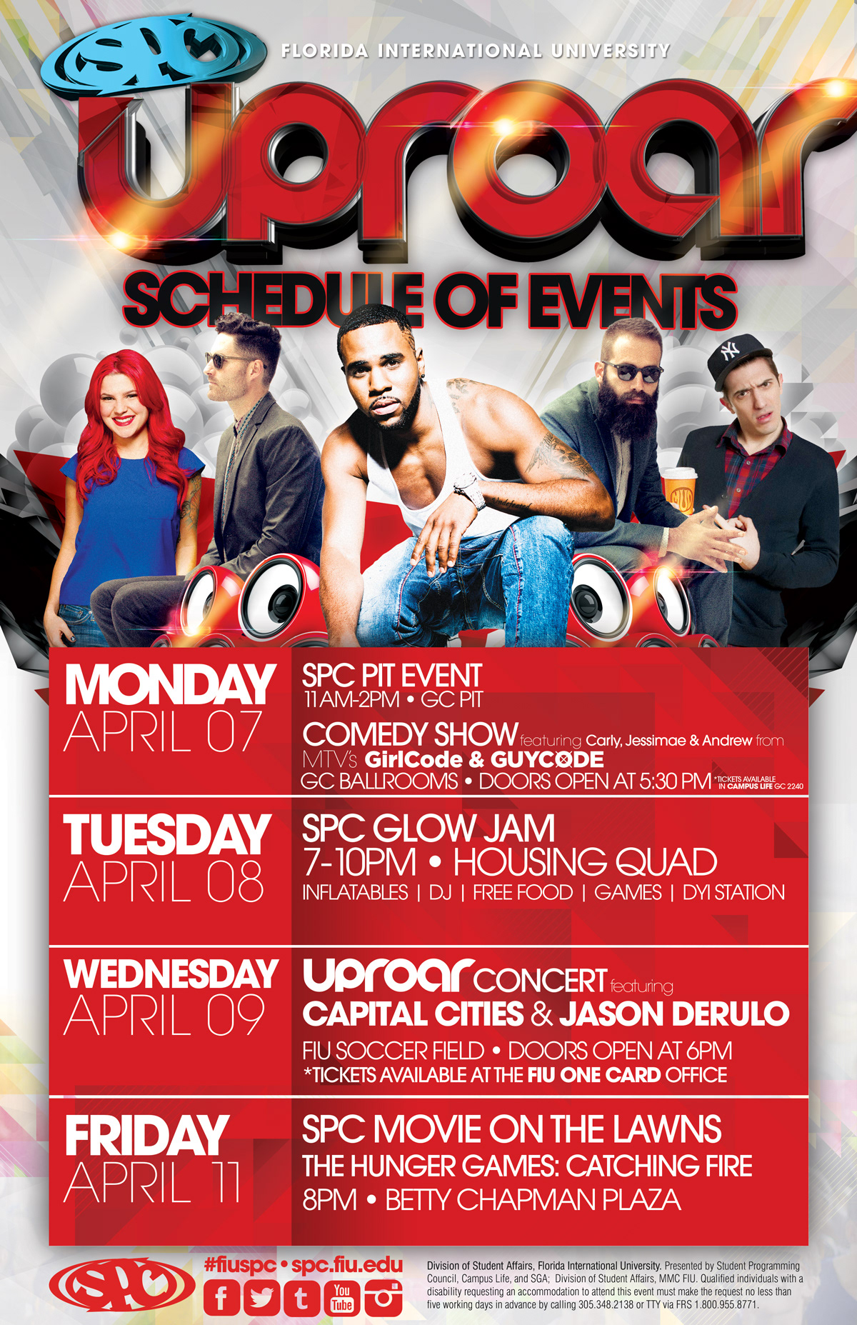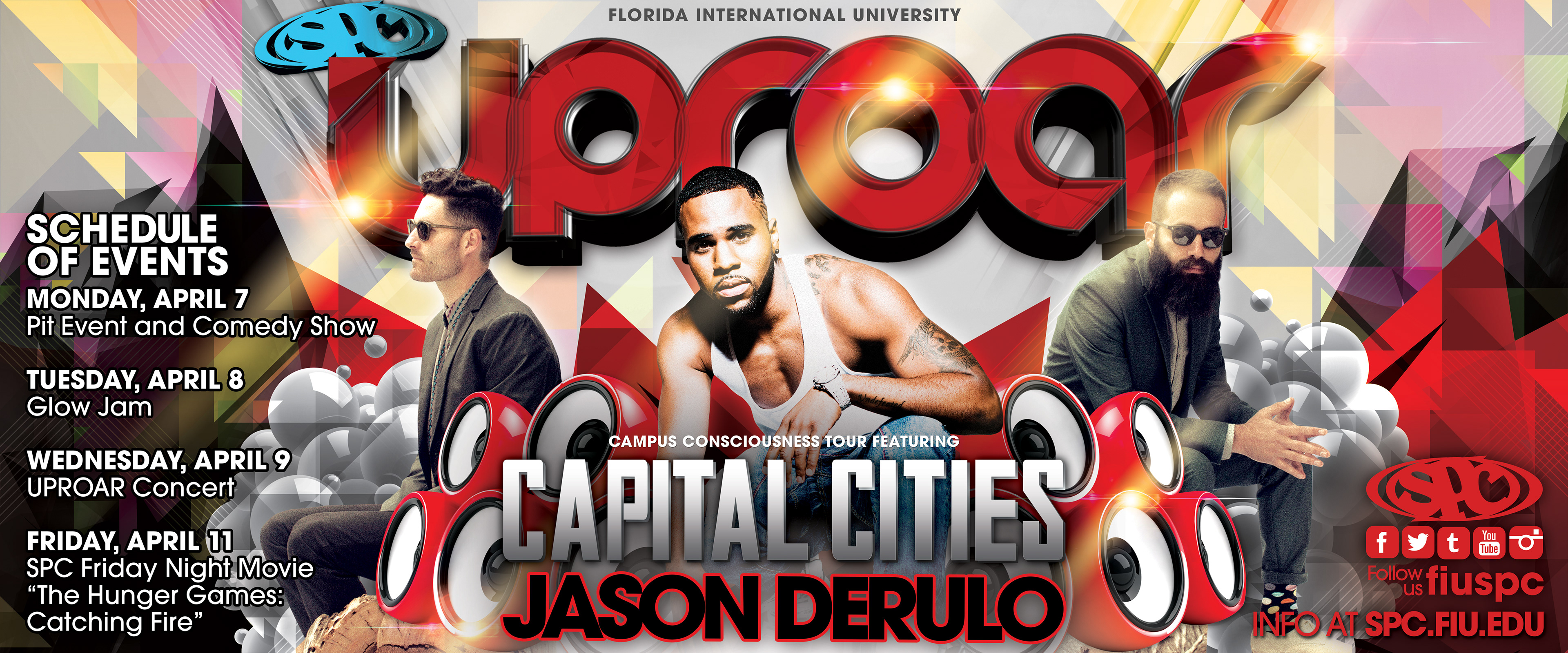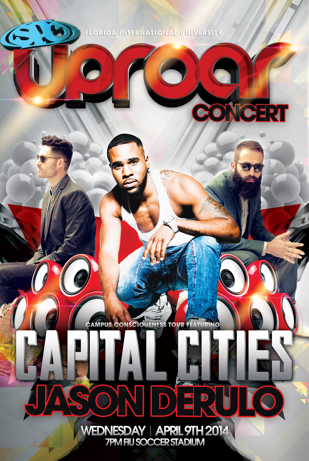 Marketing materials for SPC's spring concert at FIU featuring Jason Derulo and Capital Cities.