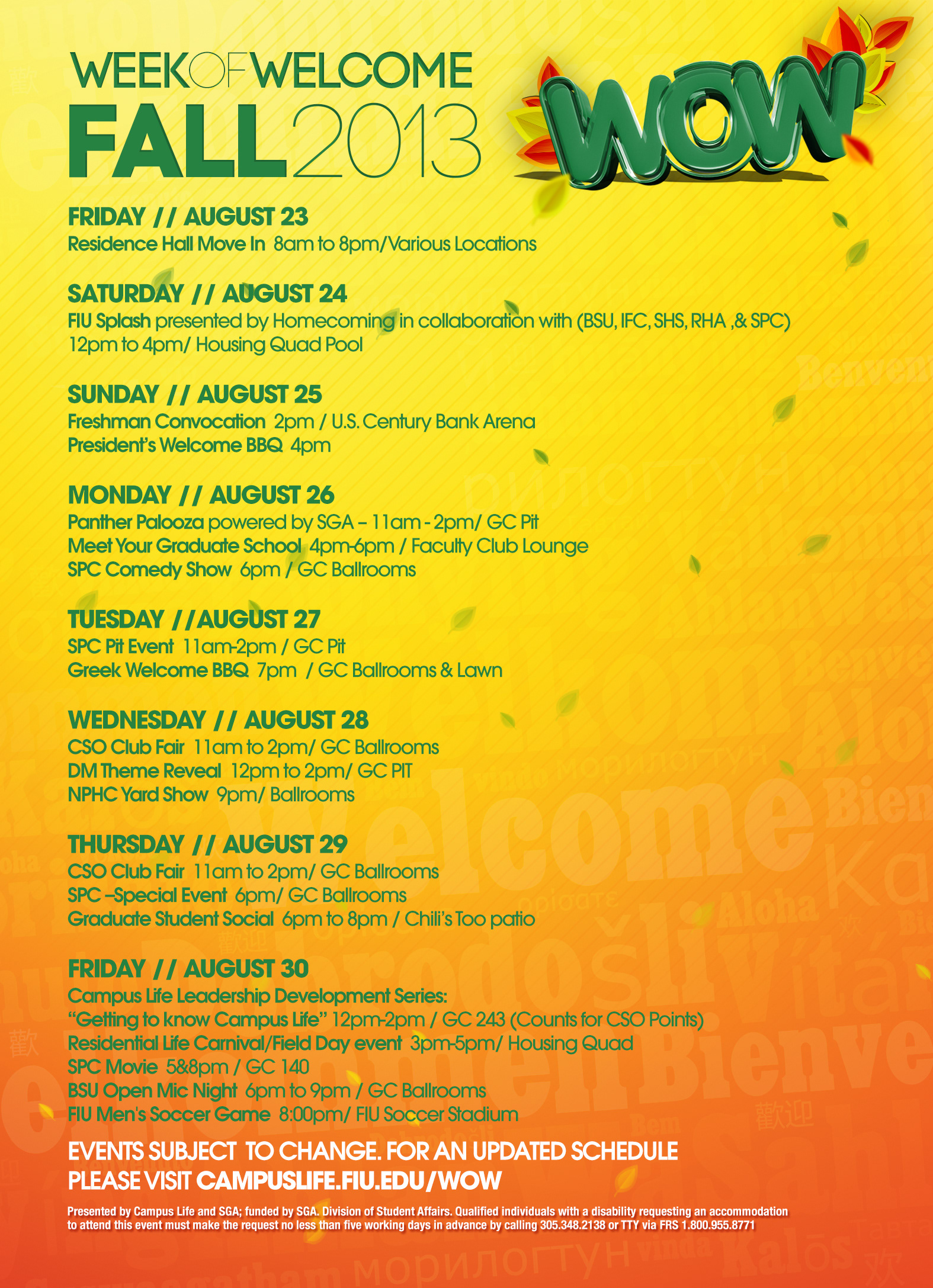 5"x7" flyer design for FIU's Week of Welcome. WOW take is a series of events that takes place during the first week of each semester.